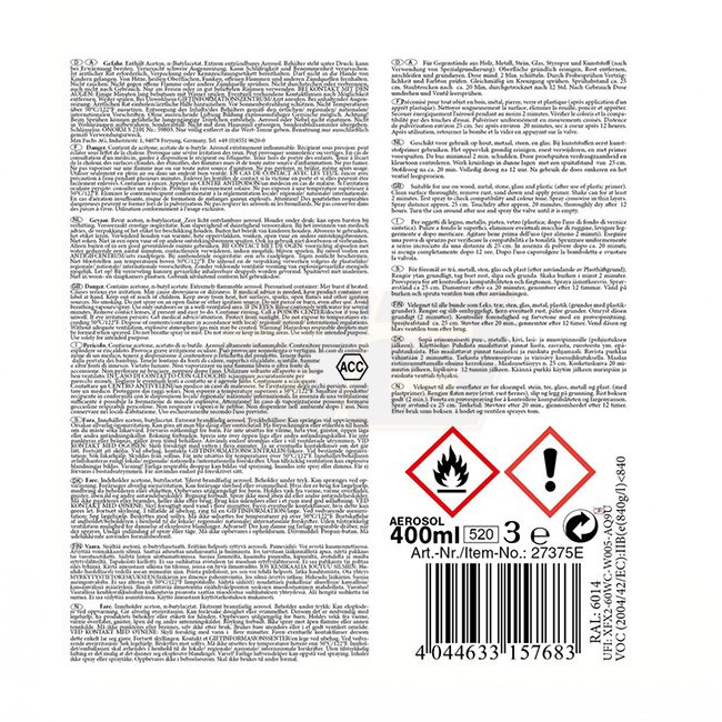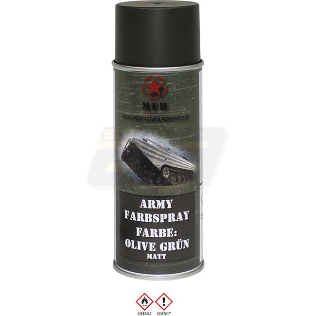 Peinture en spray MFH Army 400 ml - Vert Olive - Vernis résine nitro-combiné pour métal, bois, pierre, verre, polystyrène et plastique. Sèche au toucher en environ 20 minutes, complètement sec en environ 12 heures. RAL6014. Quantité maximale de commande =