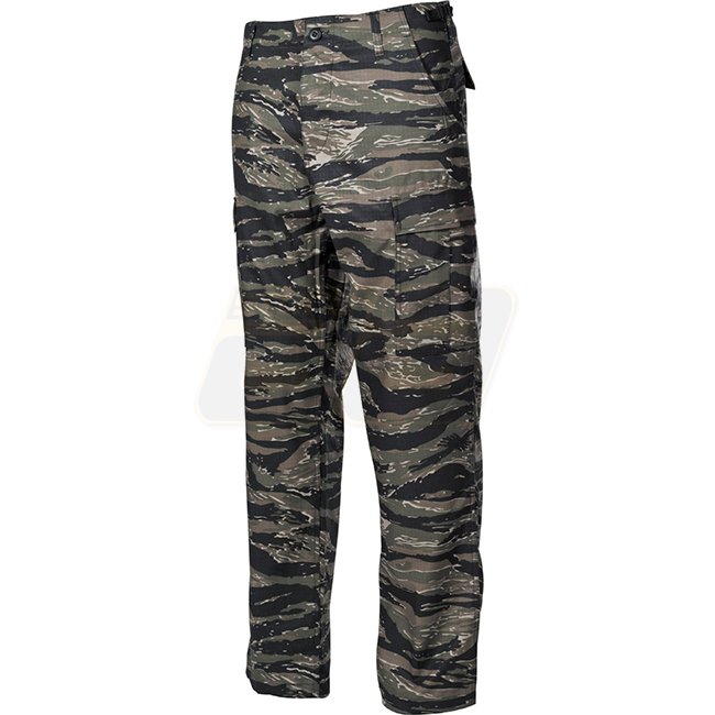 Pantalons de combat MFH BDU en motif tigre, taille S. Pantalons classiques de l'ARMÉE US en rip stop, avec fermeture à bouton, 2 poches pour les pantalons, 2 poches latérales avec rabat et boutons, 2 poches de jambe avec rabat et boutons, taille ajustable