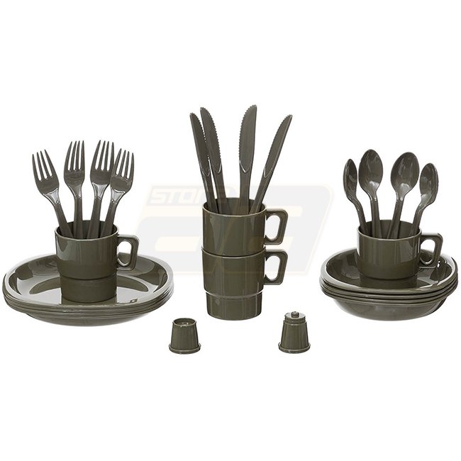 se compose de: 4 assiettes ca. 20 x 2,5 cm, ca. 300 ml 4 bols ca. 16 x 3,5 cm, ca. 350 ml 4 tasses ca. 7,5 x 8 cm, ca. 250 ml 4 couteaux 4 fourchettes 4 cuillères 1 salière et 1 poivrière emballage de transport avec poignée Dimensions d'emballage: ca. 33 x 28 x 8 cm (La x H x P) Poids avec emballage de transport: ca. 800 g