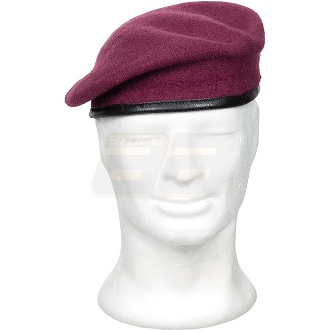 Béret Commando MFH en couleur bordeaux, taille 62. Style petit et plat avec bord en cuir et cordon de serrage. Adopte un style allemand de port et possède 2 œillets de ventilation sur le côté droit.