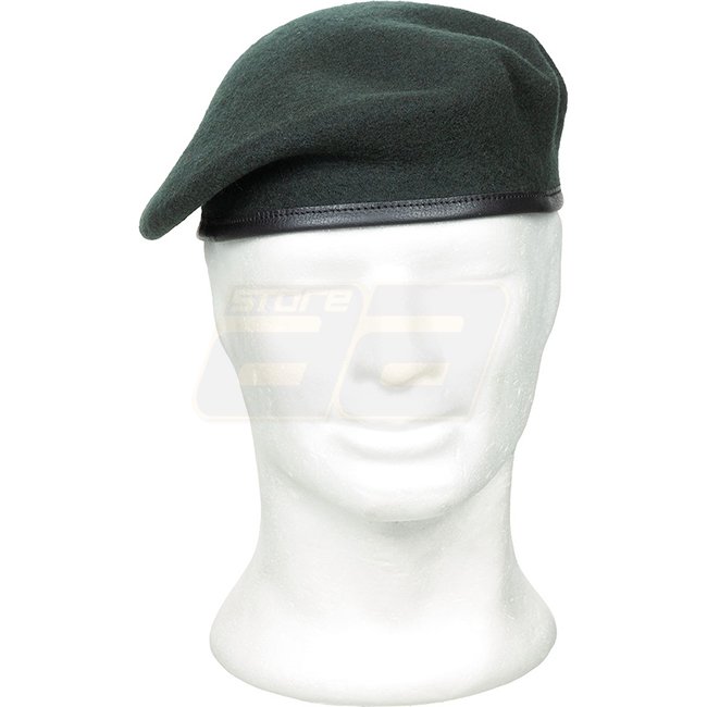 Béret commando de couleur vert foncé, taille 61. Style classique français et allemand avec un design petit et plat. Fabriqué avec une matière extérieure 100% laine et doublé de 100% coton. Dispose d'un bord en cuir avec cordon de serrage, 2 œillets de ven