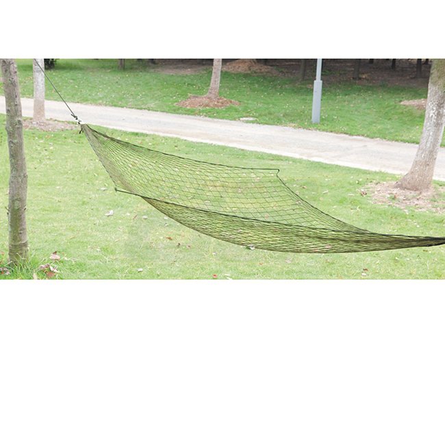 Hamac net compact avec des anneaux en métal et des cordes de fixation. Léger, portable et durable. Parfait pour les aventures en plein air. Dimensions : 185 x 52 cm. Poids : 270g. Fabriqué en 100 % polyamide.