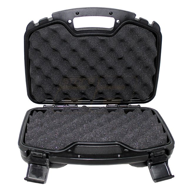 Mallette à Pistolet en Plastique Verrouillable MFH Grande - Noire. Mallette antichoc avec fermetures à pression, poignée, œillets de verrouillage, joint en caoutchouc, couvercle étanche à l'eau, mousse alvéolée à l'intérieur. Dimensions : 34,5 x 27 x 9 cm
