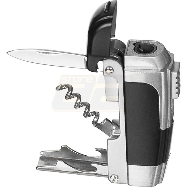 Briquet multiusage coupe-vent avec couteau intégré, tire-bouchon et ouvre-bouteille. Rechargeable et réglable en flamme. Dimensions : environ 7 x 3,5 x 2 cm.