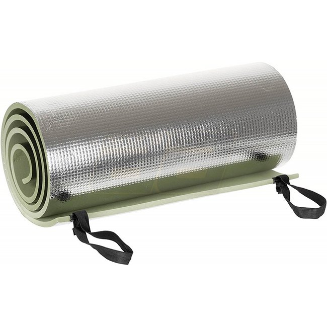 Matelas de sommeil MFH revêtu d'aluminium - Olive : Matelas de sommeil confortable et léger avec des sangles élastiques. Taille du paquet 50x16x16cm, dimensions 200x50x1cm, poids 280g. Fabriqué en 90% EVA, 10% Aluminium.