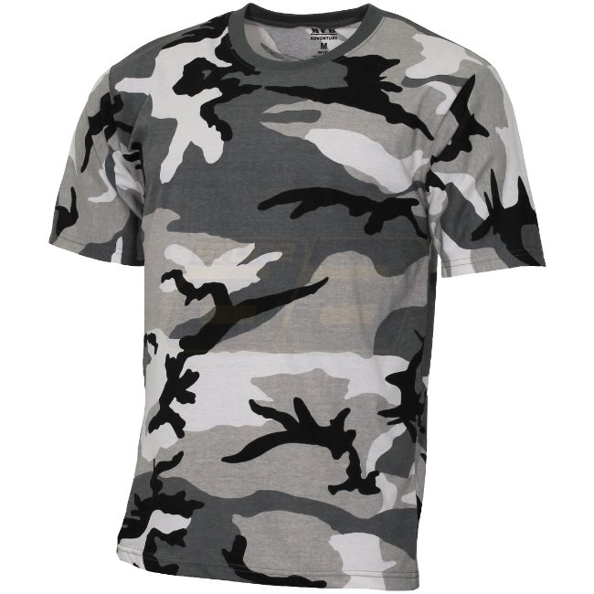 T-shirt élégant MFH Streetstyle en motif camo urbain. Tee-shirt army à manches courtes avec col renforcé. Fabriqué en 100% coton, 140-145 g/m2.