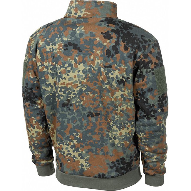 Veste tactique MFH en motif de camouflage Flecktarn, taille 3XL. Fermeture éclair avant, poignets tricotés aux manches et à la taille, col montant, 2 poches latérales avec fermeture éclair, 2 poches sur le haut du bras avec fermeture éclair et port pour é