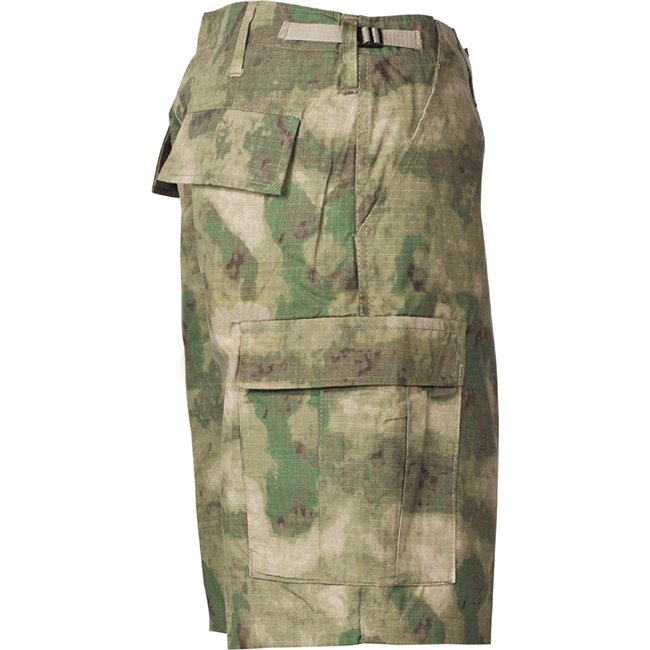 Shorts Bermude MFH US pratiques et durables en Ripstop dans le camouflage HDT FG. Braguette à boutons, 6 poches spacieuses, ceinture réglable et passants de ceinture larges. Fabriqué en 100 % coton. Parfait pour les activités en plein air.