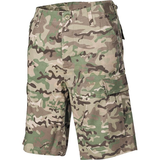 Shorts Bermuda Ripstop MFH US de haute qualité en Camouflage d'Opération, avec une fermeture à bouton et plusieurs poches. Taille ajustable avec des passants de ceinture extra larges. Fabriqué en 100 % coton.