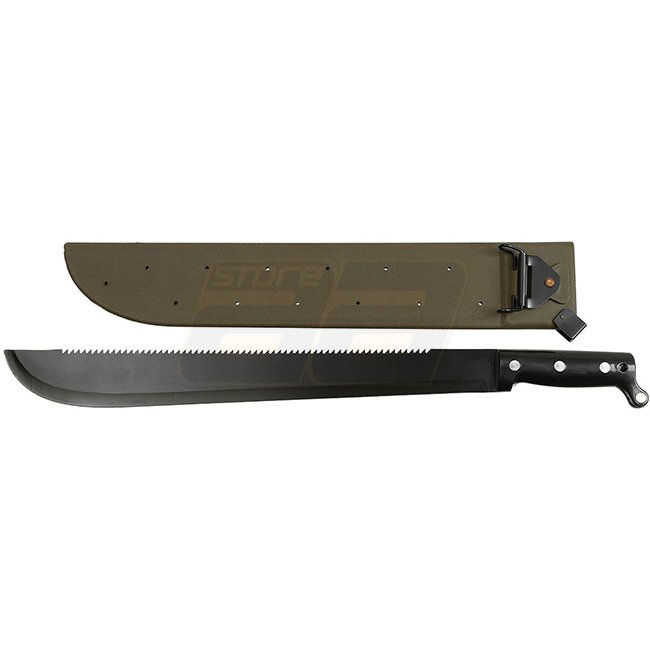 Obtenez le MFH US Bolo Machete dans une finition noire élégante avec dos de scie, poignée en bakélite, protection pour les doigts, œillet et fourreau. Outil ultime, compact mais efficace.