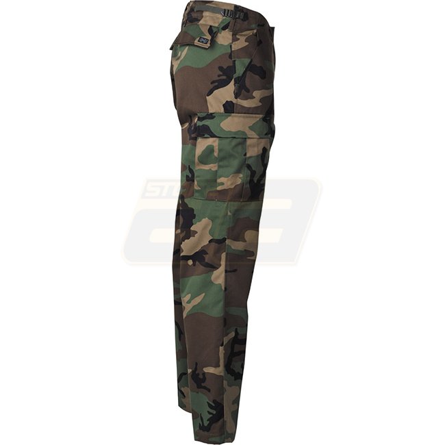 Pantalons de combat MFH US - Woodland - M. Pantalons classiques de l'US ARMY avec fermeture éclair à l'avant, 2 poches à pantalons, 2 poches latérales et 2 poches sur les jambes. Ceinture ajustable, passants de ceinture extra larges et cordon de serrage e