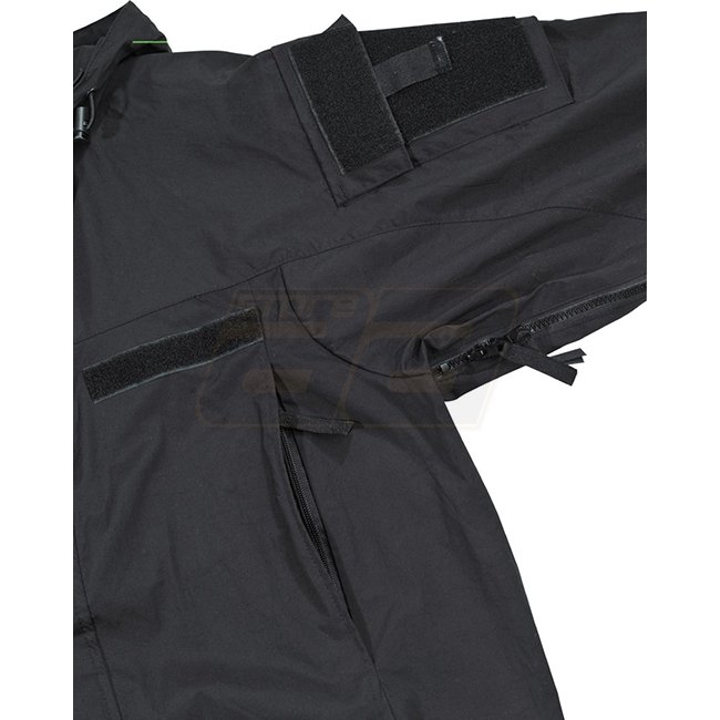 La veste Soft Shell US MFH GEN III Niveau 5 en noir est une veste imperméable, coupe-vent et respirante avec une fermeture éclair dissimulée, une poche sur la poitrine, des poches sur les manches, une capuche avec cordon de serrage, des ventilations sous