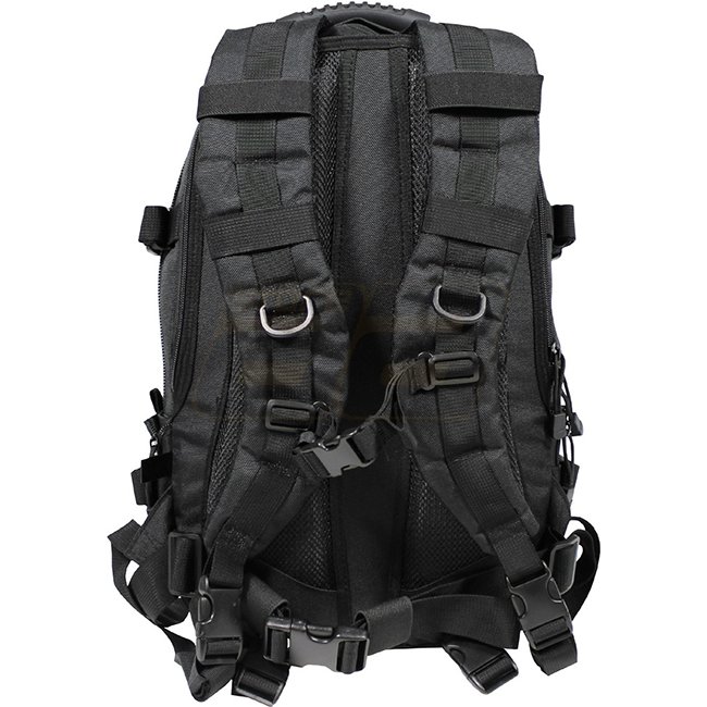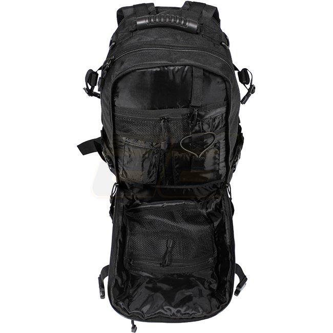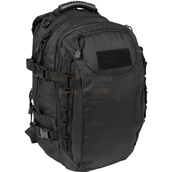 Sac à dos d'action MFHHighDefence en noir. Bretelles réglables et rembourrées, sangles de poitrine et de taille. Dos rembourré avec poche zippée double sens, compartiment coulissant, ouverture supérieure pour tube de boisson. Plusieurs compartiments, poch