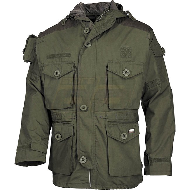 Veste Commando SMOCK HighDefence MFH de haute qualité en Olive - M. Dotée d'une fermeture éclair avant dissimulée à 2 voies avec boutons, de plusieurs poches avec rabat et fermeture à bouton, de D-rings, d'œillets pour l'eau, d'une taille ajustable, d'une