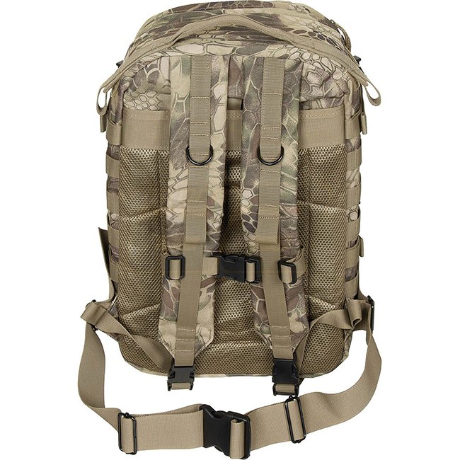 Le sac à dos MFHHighDefence US Assault 2 - Snake FG offre confort et organisation pour vos aventures en plein air. Des bretelles rembourrées ajustables, des sangles de poitrine et de taille détachables, et une partie arrière rembourrée en maille respirant