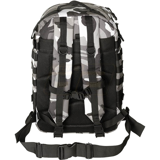 Sac à dos MFHHighDefence US Assault 2 - Camouflage Urbain : Bretelles rembourrées ajustables, sangles de poitrine et de taille détachables, matériau en maille respirante, compartiment pour poche d'hydratation, plusieurs poches, boucles d'attache Molle. Ca