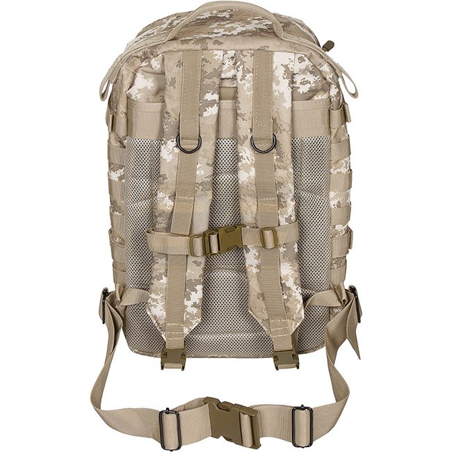 Sac à dos MFHHighDefence US Assault 2 - Désert Vegetato avec bretelles rembourrées réglables, sangles de poitrine et de taille détachables, dos rembourré en maille respirante, compartiment pour poche d'hydratation, boucles d'attache Molle, et capacité de