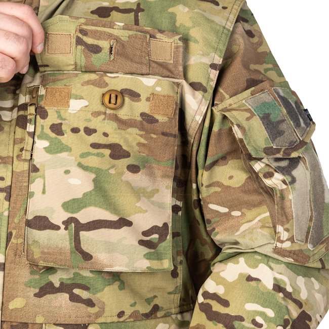 • Poches sur les Bras: Deux poches sur les bras, accessibles par des rabats supérieurs ou des fermetures éclair latérales, recouvertes de Velcro pour attacher des Patches.
