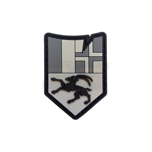 Patch tactique compact comportant un design de fourche noire avec des dimensions de 37 x 45 mm et un dos Velcro pour une fixation facile.