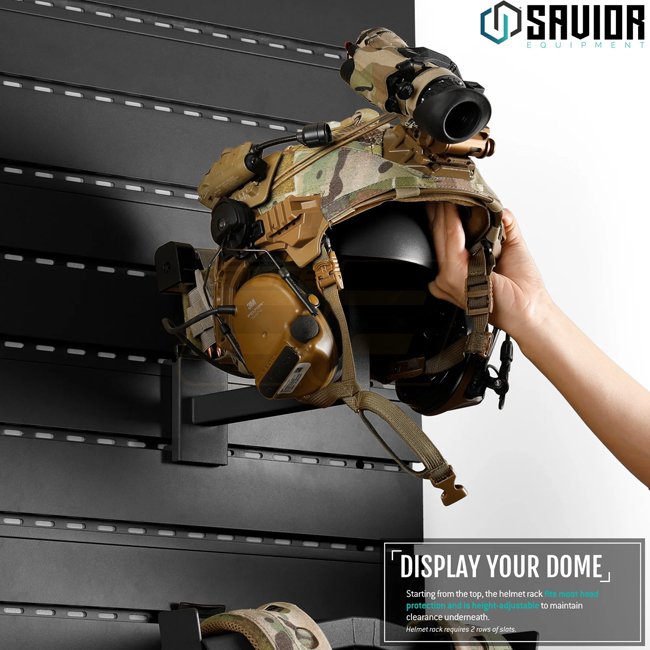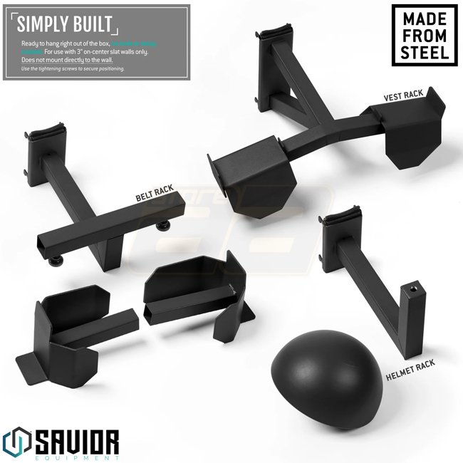 Porte-casque, porte-plaques et porte-ceinture compacts, compatibles avec le système de support mural Savior Equipment.