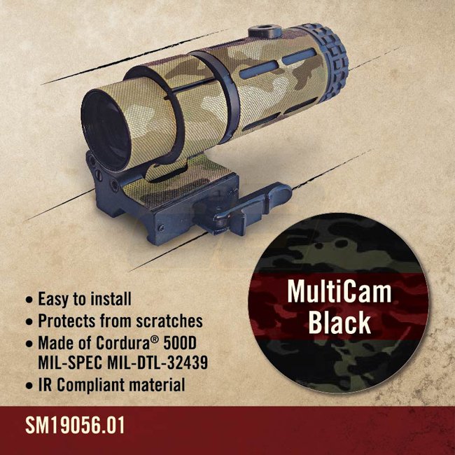 Protégez votre équipement avec le revêtement pour optique Sightmark SM19064 - Multicam Noir. Brise contour, matériau conforme IRR, Cordura 500D. Léger 20g. Compatible avec le magnifieur Sightmark T-5.