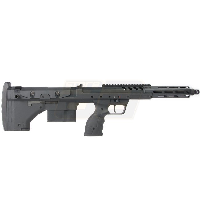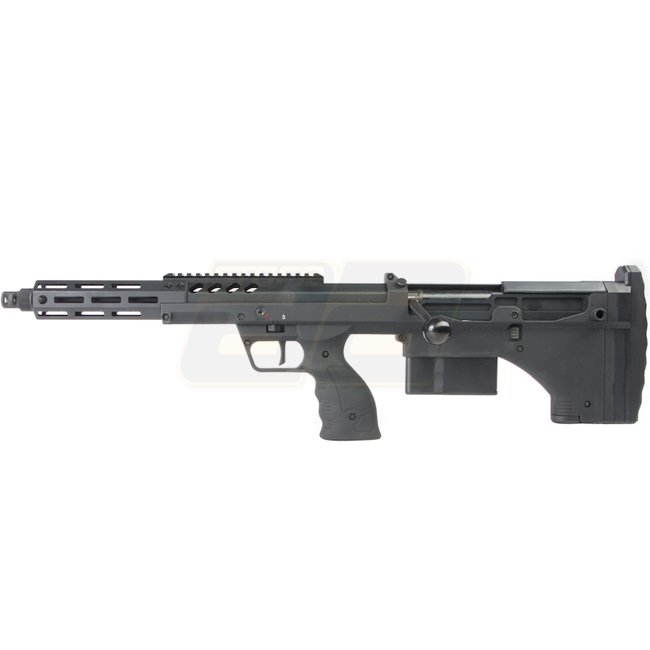 Silverback Desert Tech SRS A2/M2 Covert 16 pouces pour gaucher - Noir est une réplique airsoft à propulsion par ressort faite de métal et de crosse en nylon. Elle a une capacité de magasin de 25 (6mm) et une longueur de 708mm. Pesant 2350g, elle présente