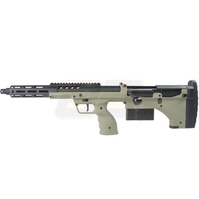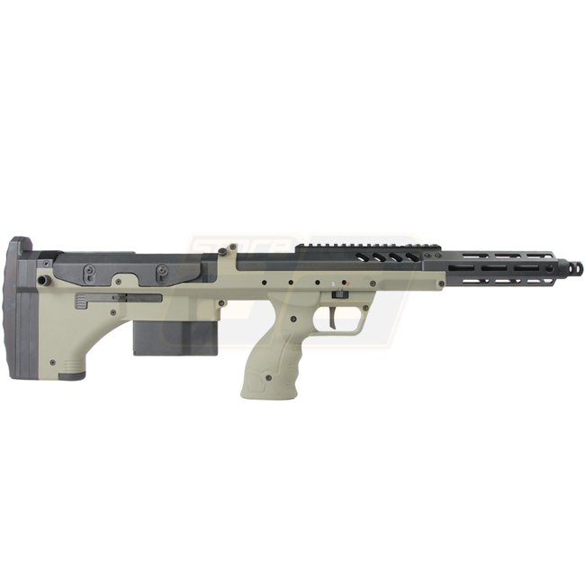 Silverback Desert Tech SRS A2/M2 Covert 16 Pouces Gauche - Olive. Système à ressort, crosse en métal/nylon, capacité du chargeur 25 (6mm), longueur 708mm, poids 2350g, longueur du canon intérieur 406mm, mode de tir coup par coup. Le paquet comprend l'arme