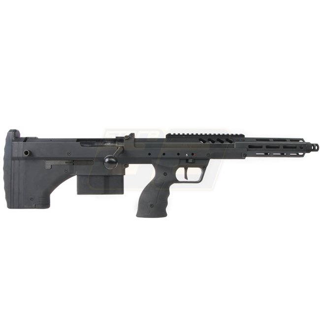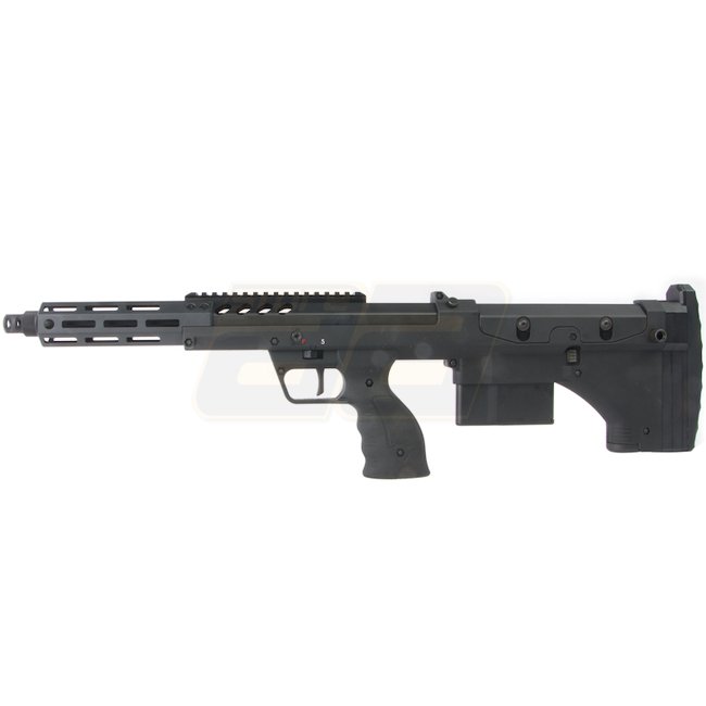 Fusil airsoft Silverback Desert Tech SRS A2/M2 Covert 16 pouces pour droitier en couleur noire, élégant et puissant. Les caractéristiques incluent une capacité de chargeur de 25 billes, un filetage de bouche de 14mm, un hop-up réglable, et une portée de t