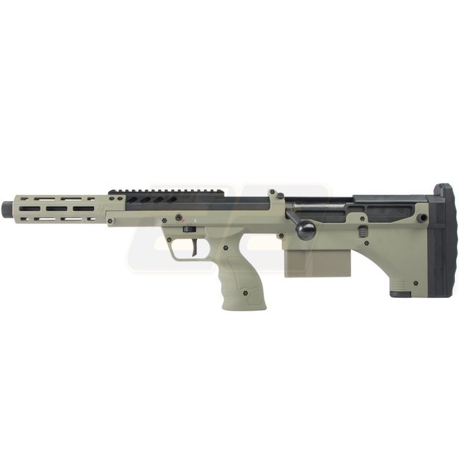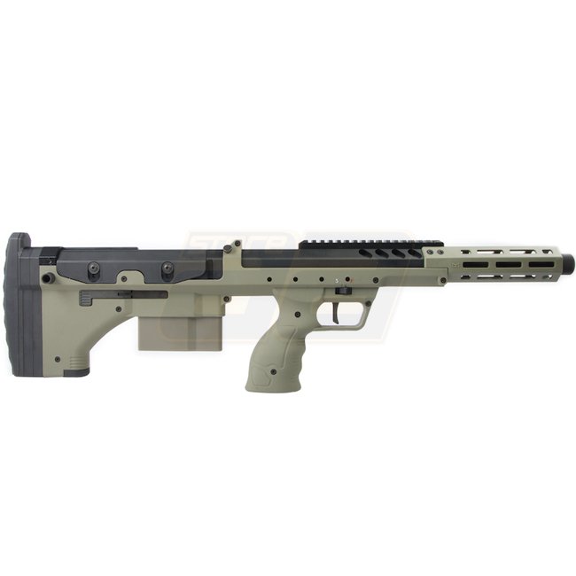 Un fusil airsoft à propulsion par ressort de haute qualité conçu pour les tireurs gauchers, le Silverback Desert Tech SRS A2/M2 Sport dispose d'un canon de 16 pouces et d'une crosse de couleur olive. Avec une capacité de chargeur de 25 coups (6mm) et une