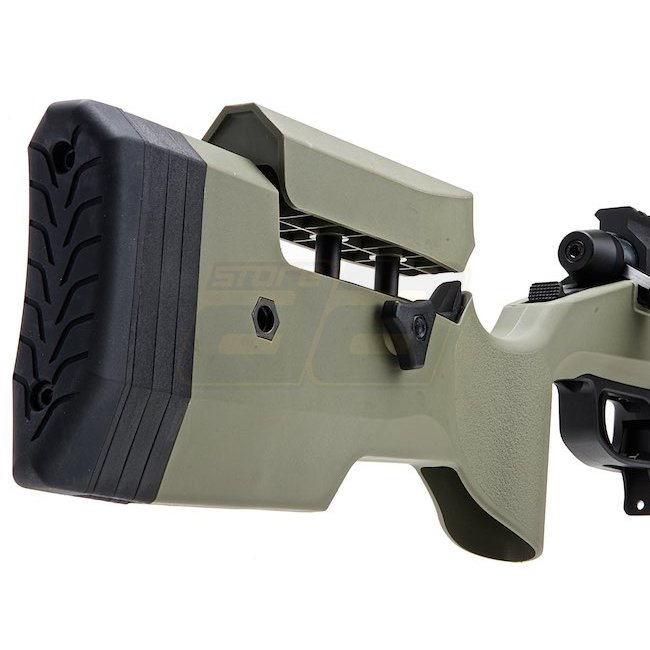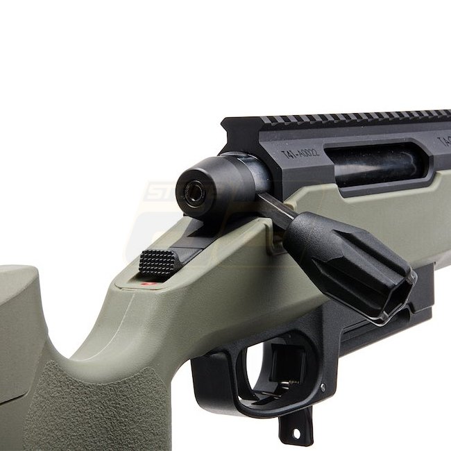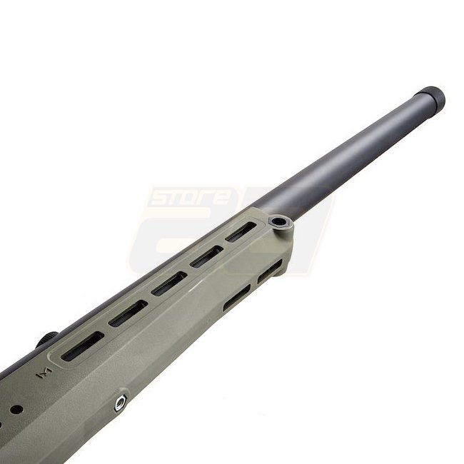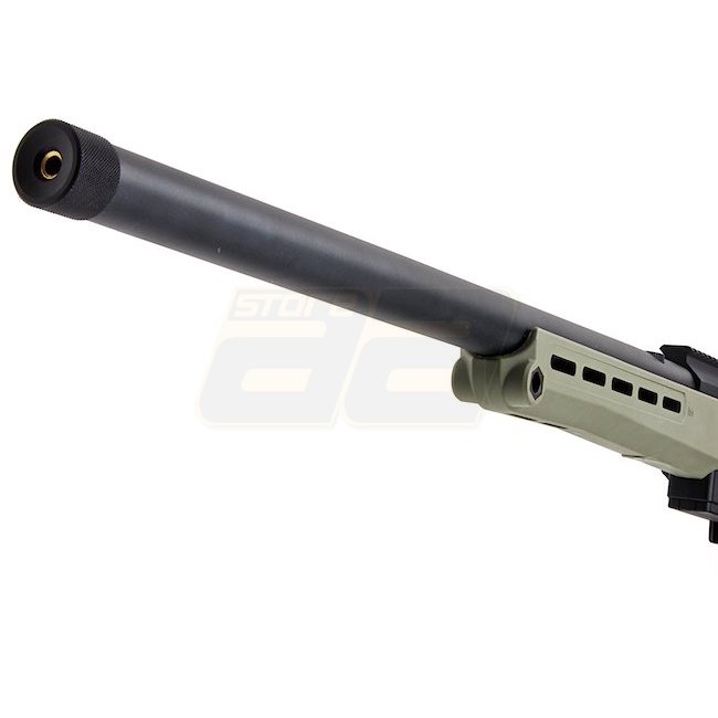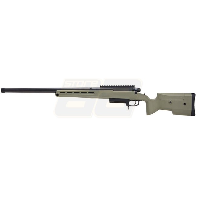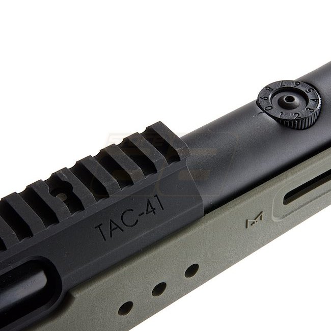Fusil à verrou Silverback TAC-41 - Olive. Crosse en métal / nylon, chargeur de 48 cartouches, longueur de 1090 mm, poids de 2730 g, canon interne de 510 mm, filetage de bouche de 24 mm+, vitesse de 370-390 FPS, tir unique, plage de tir de 50,76-53,51 m. H