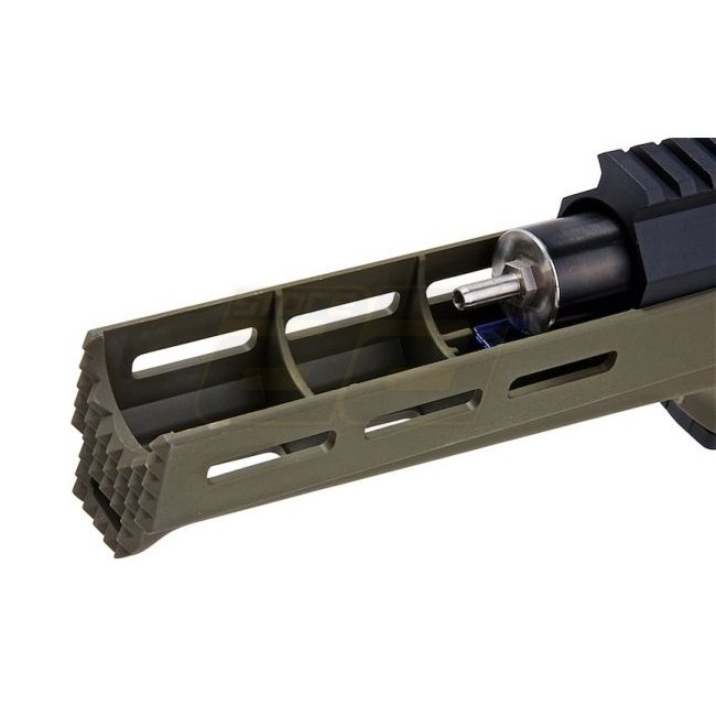 Le Silverback TAC 41 L (Version Sport) est construit avec une boîtier en nylon PA6 renforcé de fibre de verre, assurant une grande robustesse. La crosse utilise un système d'attache Picatinny pour personnaliser l'arme facilement. Le mécanisme interne, fabriqué en aluminium 6061 T6, garantit une durabilité extrême. Le système Hop-Up TDC avec 50 positions d'index offre une grande précision pour chaque tir.
