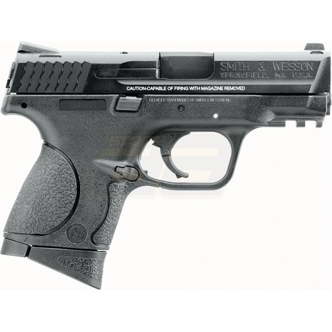 Pistolet à gaz à recul Smith & Wesson M&P9 Compact de haute qualité en noir. Construction en métal et polymère, capacité du chargeur de 14 billes, longueur de 170 mm, poids de 550 g, canon interne de 70 mm. Vitesse de bouche de 310-330 FPS / 0,89-1,01 Jou