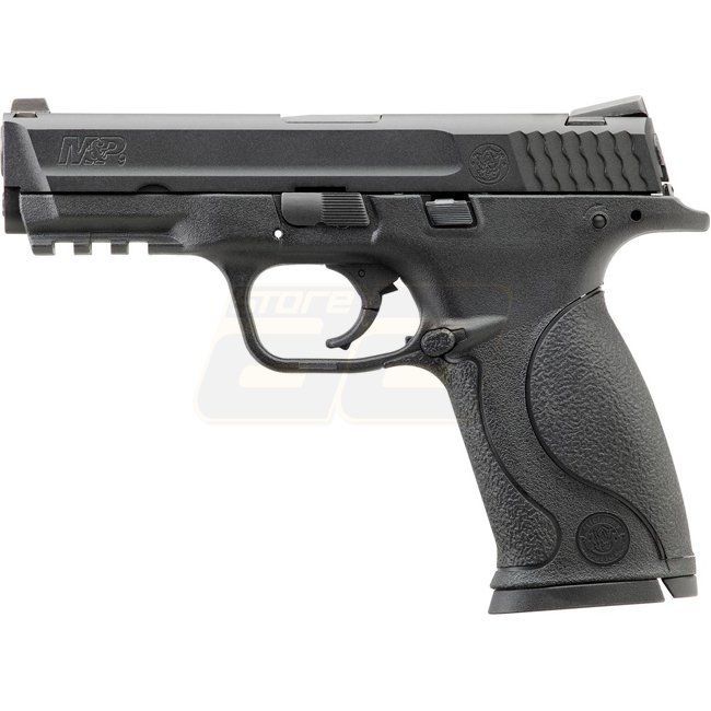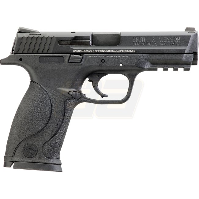 Pistolet à gaz Smith & Wesson M&P9 à culasse mobile au fini noir élégant. Construction métal/polymer, capacité de 22 billes, longueur de 195 mm, poids de 640 g, canon intérieur de 90 mm, vitesse de 330-350 FPS, mode semi-automatique, hop-up réglable. Le p