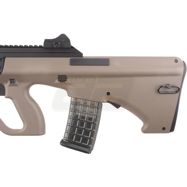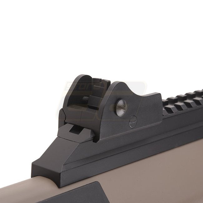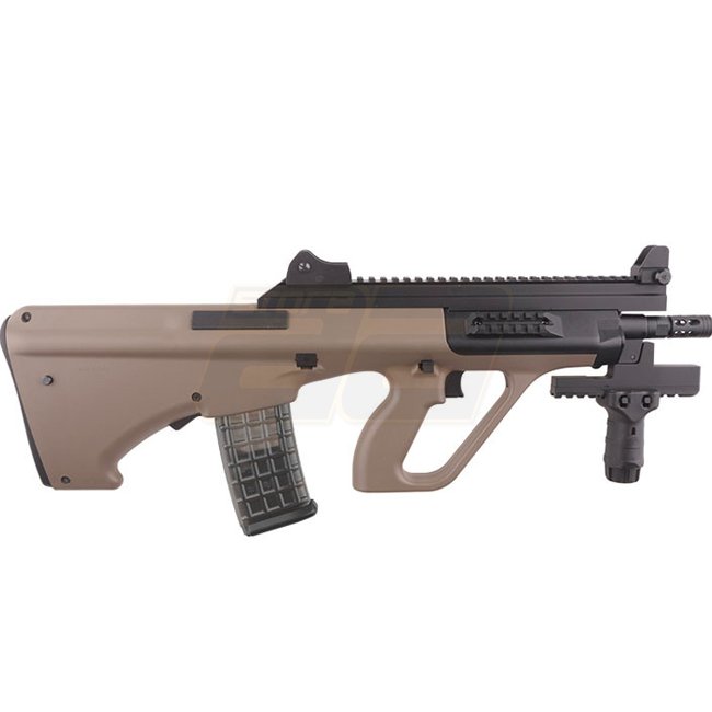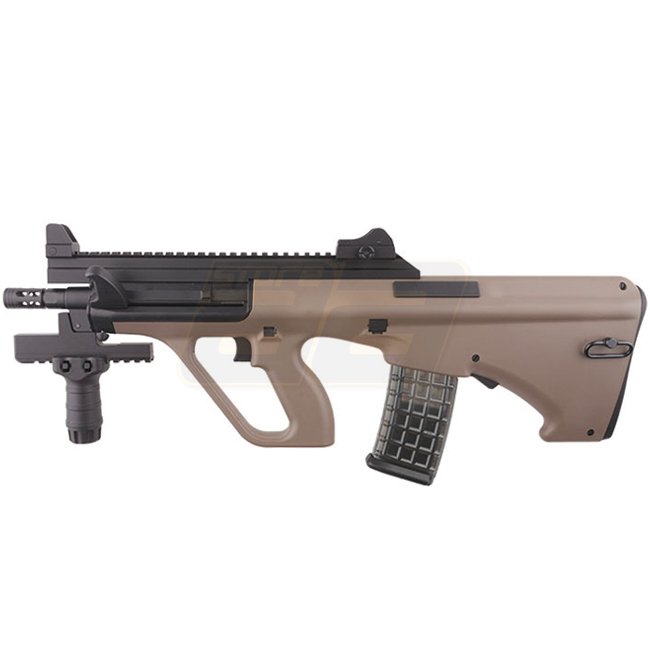 Snow Wolf SW-020T AEG - Tan. Récepteur en métal, crosse en polymère et prise en main de pistolet. Capacité du chargeur de 330 billes. Modes de tir semi-automatique et automatique. Vitesse de bouche de 380-400 FPS. Hop-up réglable. Batterie avec prise Tami