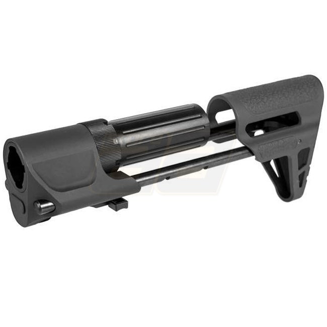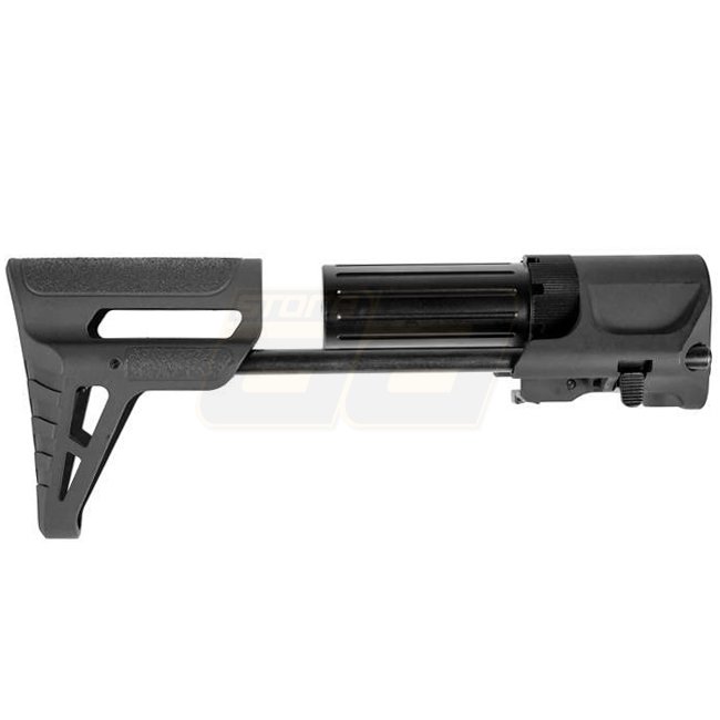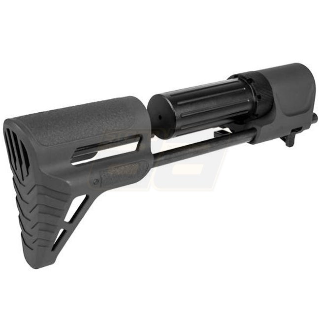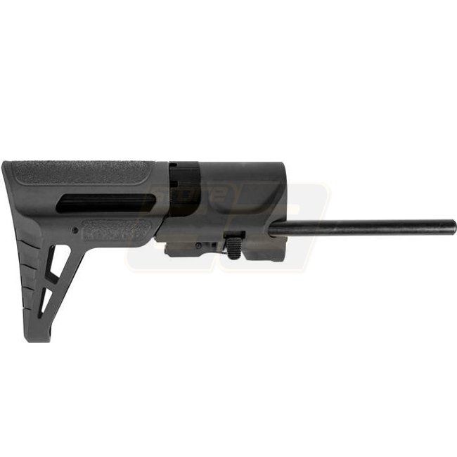 La crosse a un double verrouillage qui empêche la crosse de glisser accidentellement hors du boîtier. Dans le dummy buffer tube amovible, vous pouvez installer une batterie LiPo avec des dimensions maximales de 15 x 11 x 115mm.
