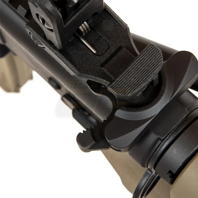 La Specna Arms RRA SA-E05 EDGE AEG haute performance présente un design bicolore avec une crosse légère. Boîtier de gearbox v2, MOSFET inclus, moteur de type long, corps en métal avec crosse et poignée en polymère. Accepte des chargeurs de 125 billes de 6