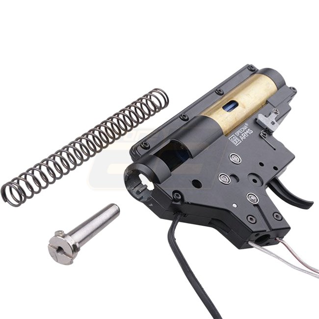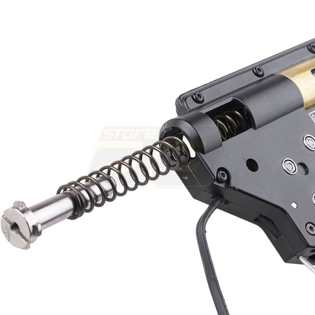 Le système de changement rapide de ressort SEAC permet à l'utilisateur de changer le ressort sans avoir à retirer la gearbox de l'AEG. Tout ce que vous avez à faire est de retirer le tube d'origine pour accéder à la goupille qui donne accès au ressort. Il n'y a pas besoin d'outils supplémentaires pour cela, en raison de la bague intégrée sur le stock-tube avec laquelle il peut être retiré facilement.