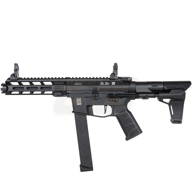 Un AR-9 court avec crosse PDW et garde-main M-Lok. Ce modèle a une cadence de tir élevée de 30 coups par seconde.