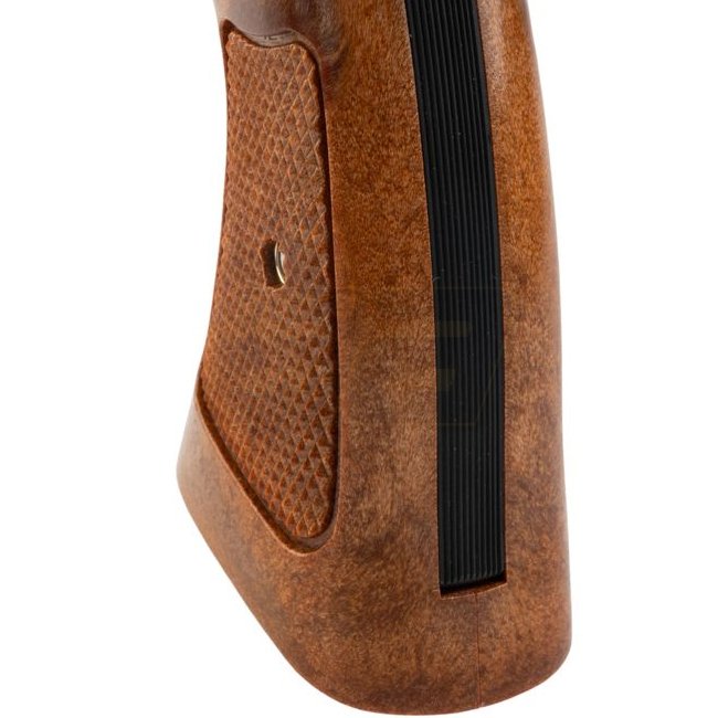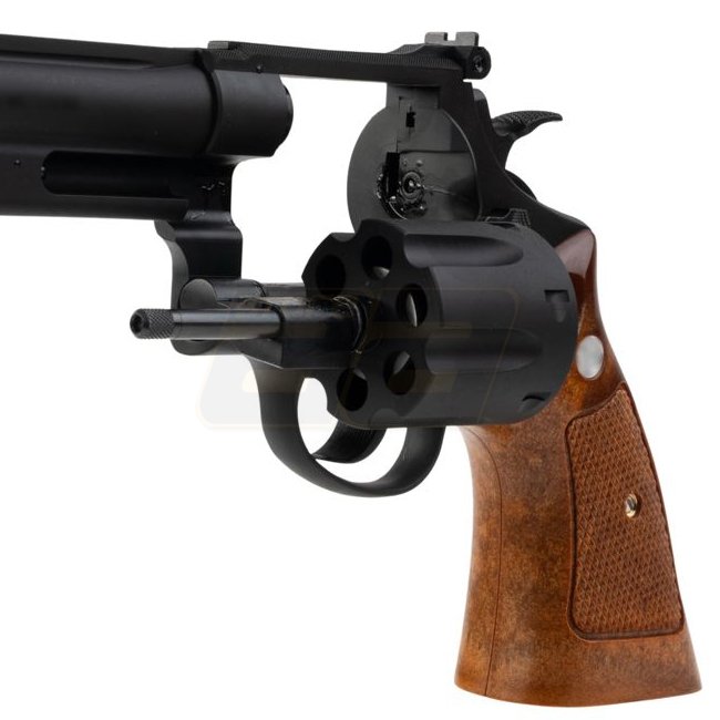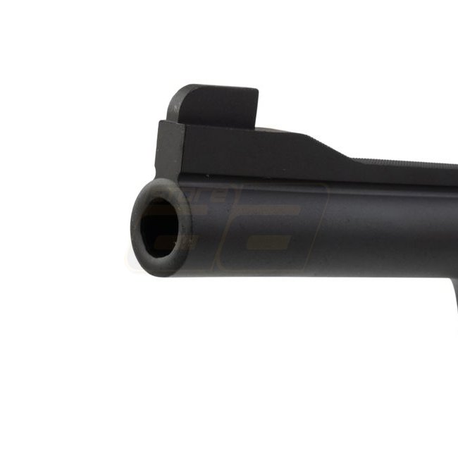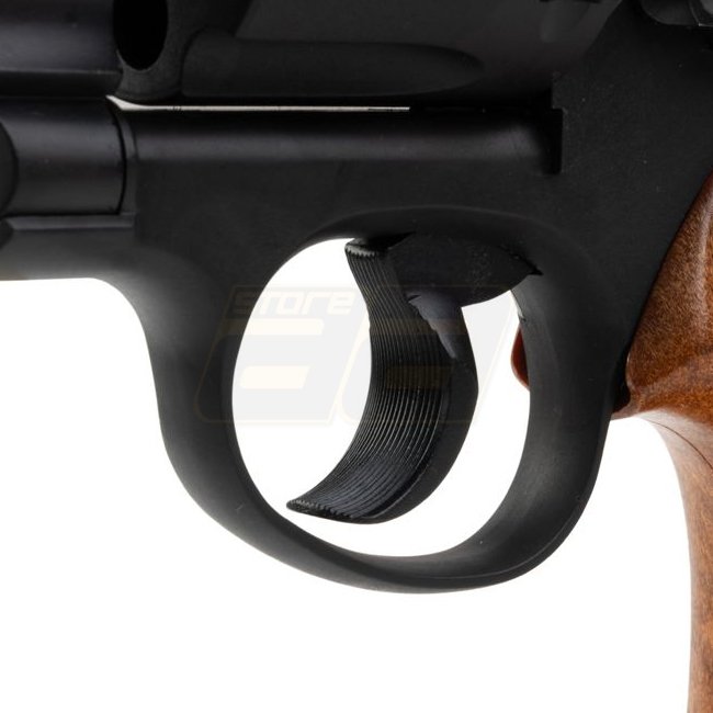 Ce modèle présente un canon conique de 6 pouces avec stries anti-reflets sur le dessus du boîtier et du canon. Il est équipé d’un barillet fraisée, d’un chien semi-large, d’une détente étroite et de plaquettes de crosse type service, pour un look rétro fidèle aux revolvers des années 70.
