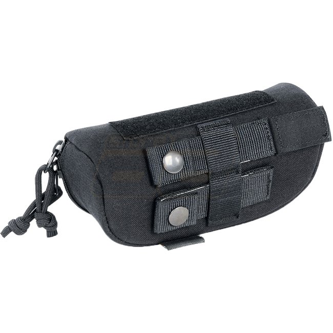 Étui rembourré noir Tasmanian Tiger pour lunettes, avec fixation universelle. Dimensions : 18 x 10 x 5 cm. Dispose d'un rembourrage important, compatible avec le système MOLLE, et d'une fermeture éclair avant double sens.