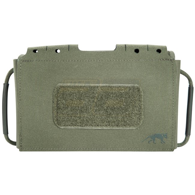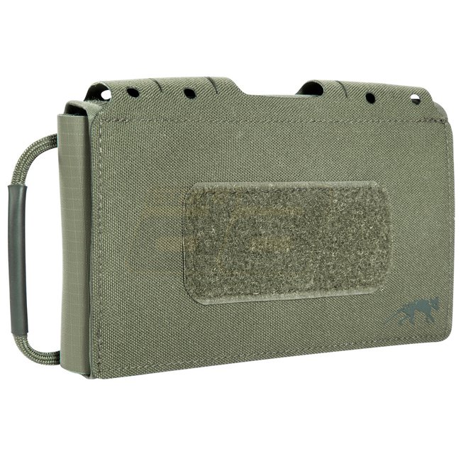 Pochette compacte Tasmanian Tiger IFAK Dual en Olive avec option de fixation ajustable, panneau de premiers secours dépliant pour un accès des deux côtés, matériau CORDURA® laminé. Les caractéristiques incluent une fermeture à crochet et boucle, des bande