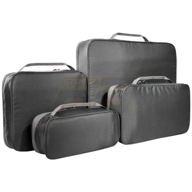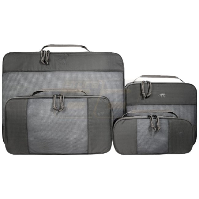 Le set de pochettes en maille Tasmanian Tiger Mesh Pocket Set XL - Gris Titan est un ensemble robuste de cubes de rangement constitué de quatre cubes à fermeture éclair avec dessus en maille. Trois petits cubes peuvent se loger dans un sac de voyage ou un