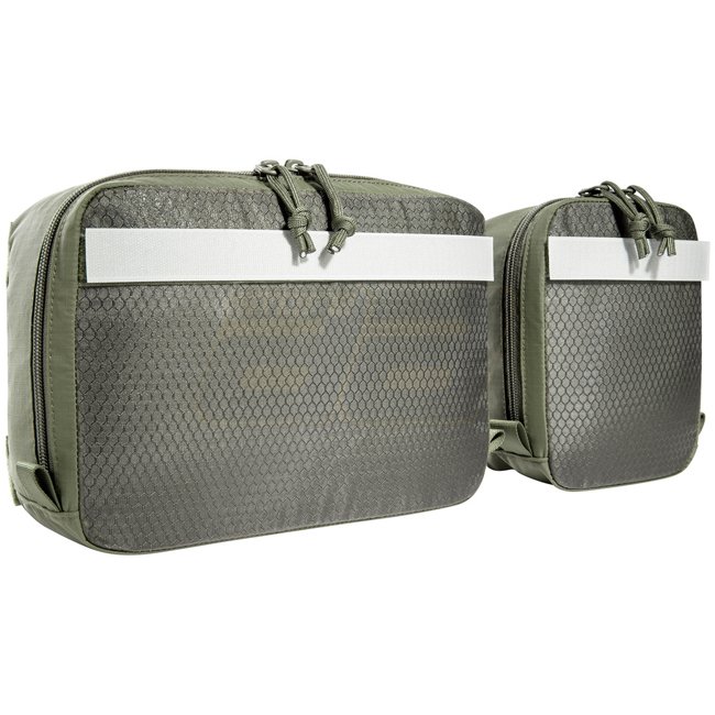 Ensemble de pochettes polyvalentes robustes Tasmanian Tiger en couleur olive pour fixation par bande auto-agrippante. Comprend deux sacs avec couvercles en maille transparente et bandes auto-agrippantes. Polyvalent, léger et facile à utiliser pour des sac
