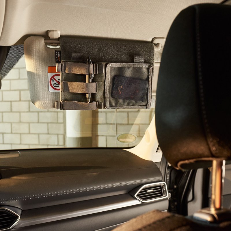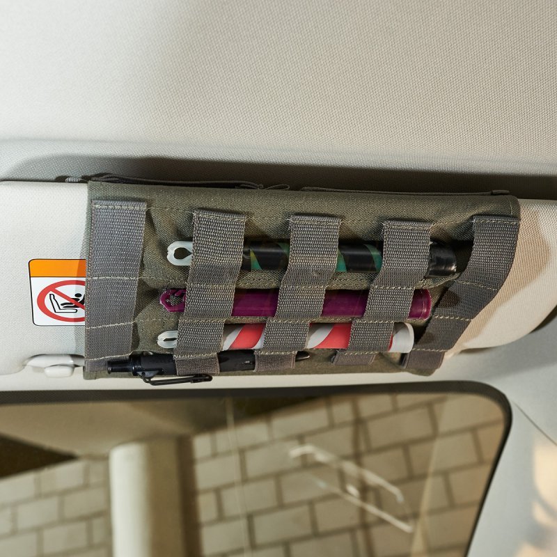 Couverture pare-soleil Tasmanian Tiger - Olive, faisant partie de la série TacVec. Coque MOLLE réglable en longueur avec couverture d'identification pour fixation sur les pare-soleil de véhicule. Comprend un porte-cartes transparent, un rabat à scratch et