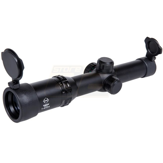Theta Optics 1-4x24 FFP Lunette de Tir - Noir : Lunette de tir de haute qualité avec un grossissement de 1-4x et un diamètre de lentille de 24 mm. Caractéristiques : tube de 30 mm, couleur de réticule rouge et verte, et batterie CR2032 de 1x. Longueur : 2