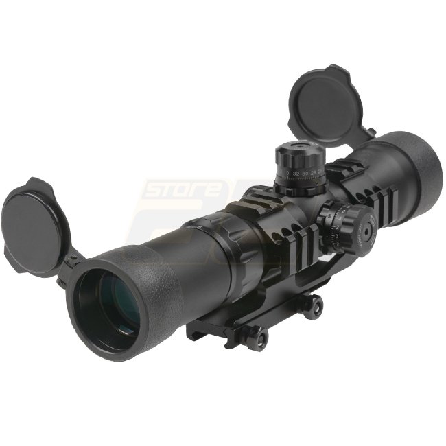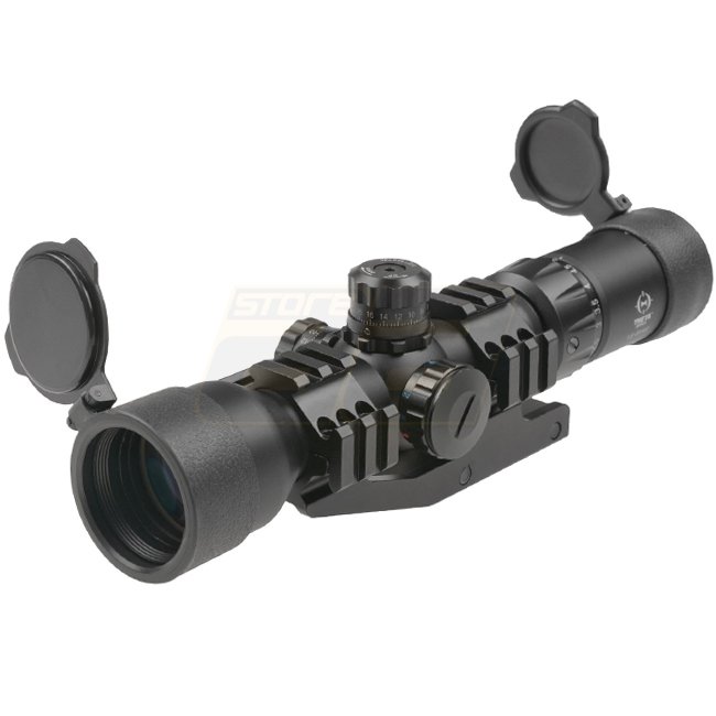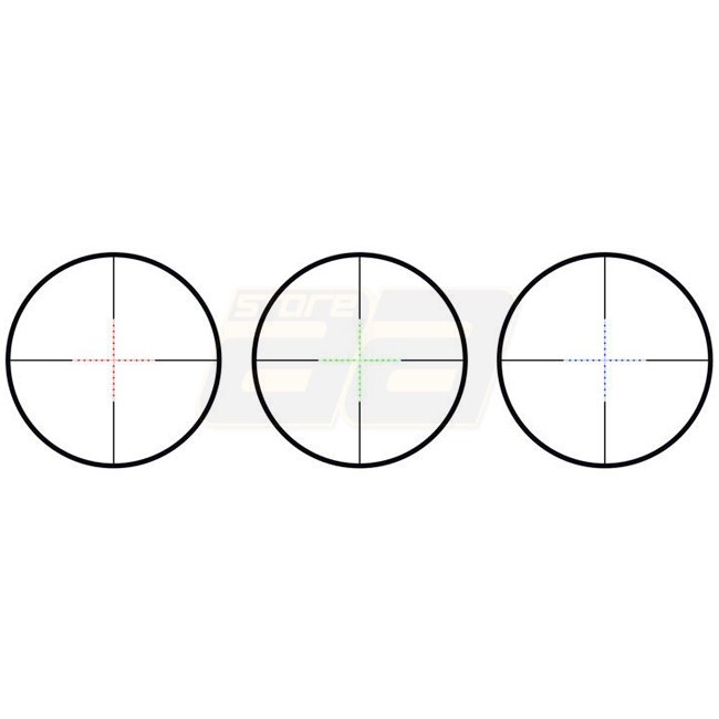 Theta Optics 1.5-5x40 BE Lunette de couleur noire avec un grossissement de 1.5-5x, un diamètre de lentille de 40 mm, des couleurs de réticule rouge, vert et bleu, batterie 1x CR2032, longueur de 265 mm et poids de 1000 g.