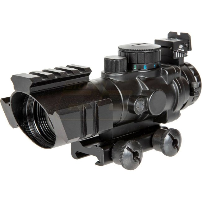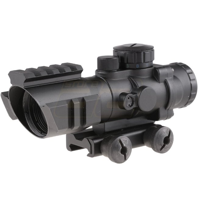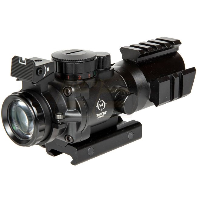 Theta Optics Rhino 4x32 Lunette sur rail - Noir - 4x de grossissement, diamètre de lentille de 32 mm, couleurs de réticule Rouge, Vert et Bleu, batterie 1x CR1620.