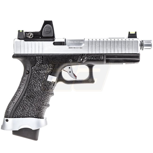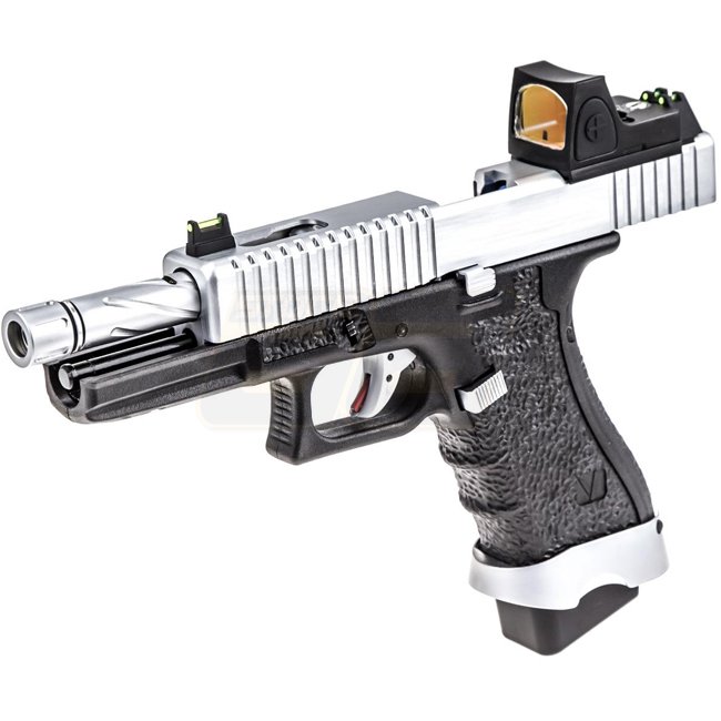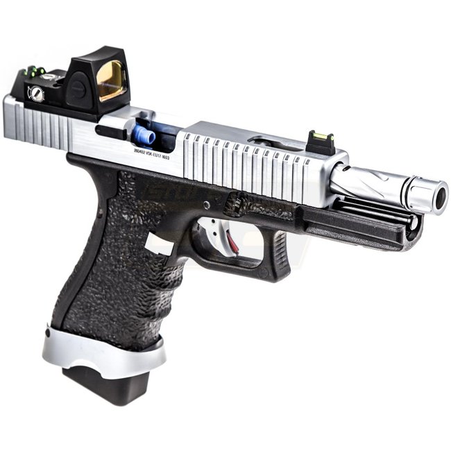 Pistolet Vorsk EU17 & BDS à gaz Blow Back - Chrome - Matériau métal/polymer, capacité du chargeur de 21 balles, longueur de 220 mm, poids de 800 g, canon intérieur de 90 mm, 320-340 FPS, semi-automatique, hop-up réglable. Livré avec pistolet, chargeur, lu