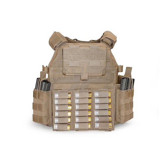 Fusil à pompe polyvalent Warrior Triple Vertical en Coyote. Compatible MOLLE, contient 18 cartouches de fusil à pompe. Idéal pour les gilets Warrior DCS, RICAS, RAPTOR et les pochettes à magazines ouverts.