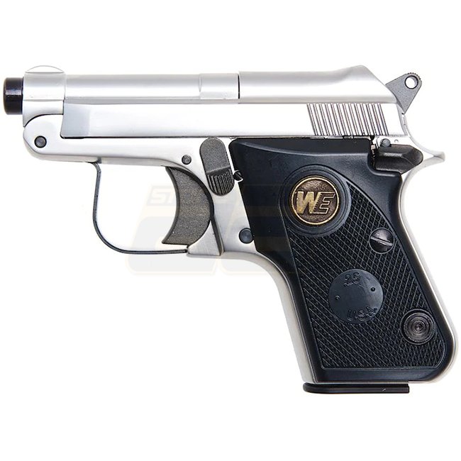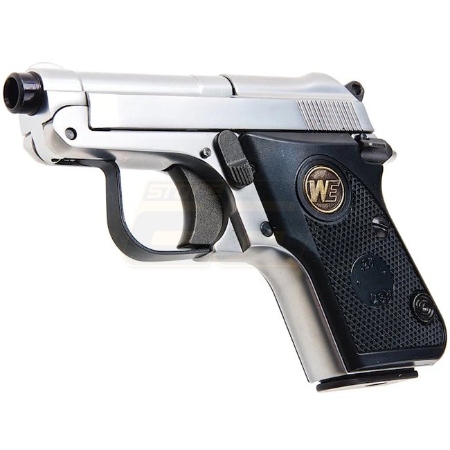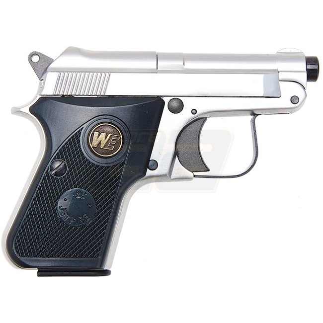 Pistolet à gaz WE 950 Blow Back - Argent : Construction en métal / polymère avec une capacité de chargeur de 8 (6mm) et une longueur de 140mm. Pèse 336g et a une longueur de canon interne de 45mm. La vitesse à la bouche varie de 280-300 FPS / 0.73-0.84 Jo